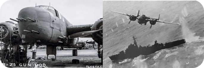 Kenney had a small and somewhat ragtag air force at his disposal: a handful of B-17 and B-24 heavy bombers, Marine Corps fighters, some Australian light bombers, occasional aid from US Navy carrier aircraft, and a fair number of AAF medium-range B-25s and A-20s. Taking inspiration from the Australians, Kenney and his ingenious team of pilots, engineers, and mechanics outfitted his A-20s and B-25s for strafing and low-altitude bombing. His B-25C-1s, for instance, sported eight forward-firing .50cal machine guns. His crews experimented with parachute-equipped bombs (designed by Kenney himself), new fuses designed for very low-altitude release, and “skip bombing”—dropping bombs so they skipped across the water at a target like a rock on a pond. All this innovation made Kenney’s light bombers near-perfect weapons for destroying ships at sea.